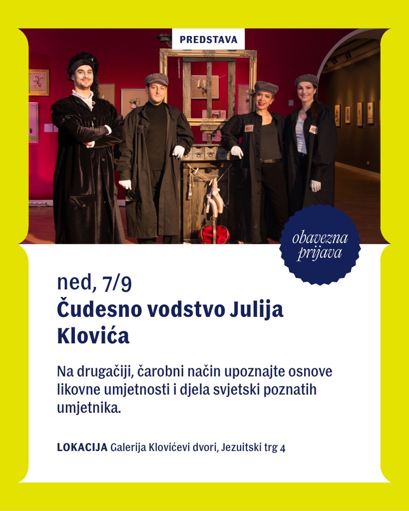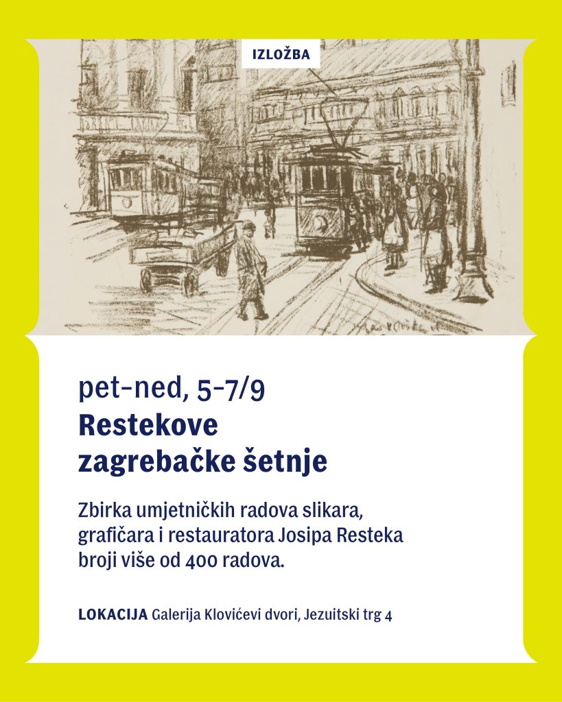 Galerija Klovićevi dvori priključila se Zagrebačkom muzejskom vikendu s izložbom Restekove zagrebačke šetnje – izbor iz donacije Josipa Resteka povodom 110. godišnjice rođenja i predstavom Čudesno vodstvo Julija Klovića. Izložbu ćete moći razgledati od 4. do 7. rujna od 10 do 20 sati, a predstavu Čudesno vodstvo Julija Klovića u nedjelju, 7. rujna 2025. u 12 i 14 sati. Za predstavu je ograničen broj mjesta, pa se požurite prijaviti! Prijaviti se možete preko službene stranice: MUV – Čudesno vodstvo Julija Klovića.