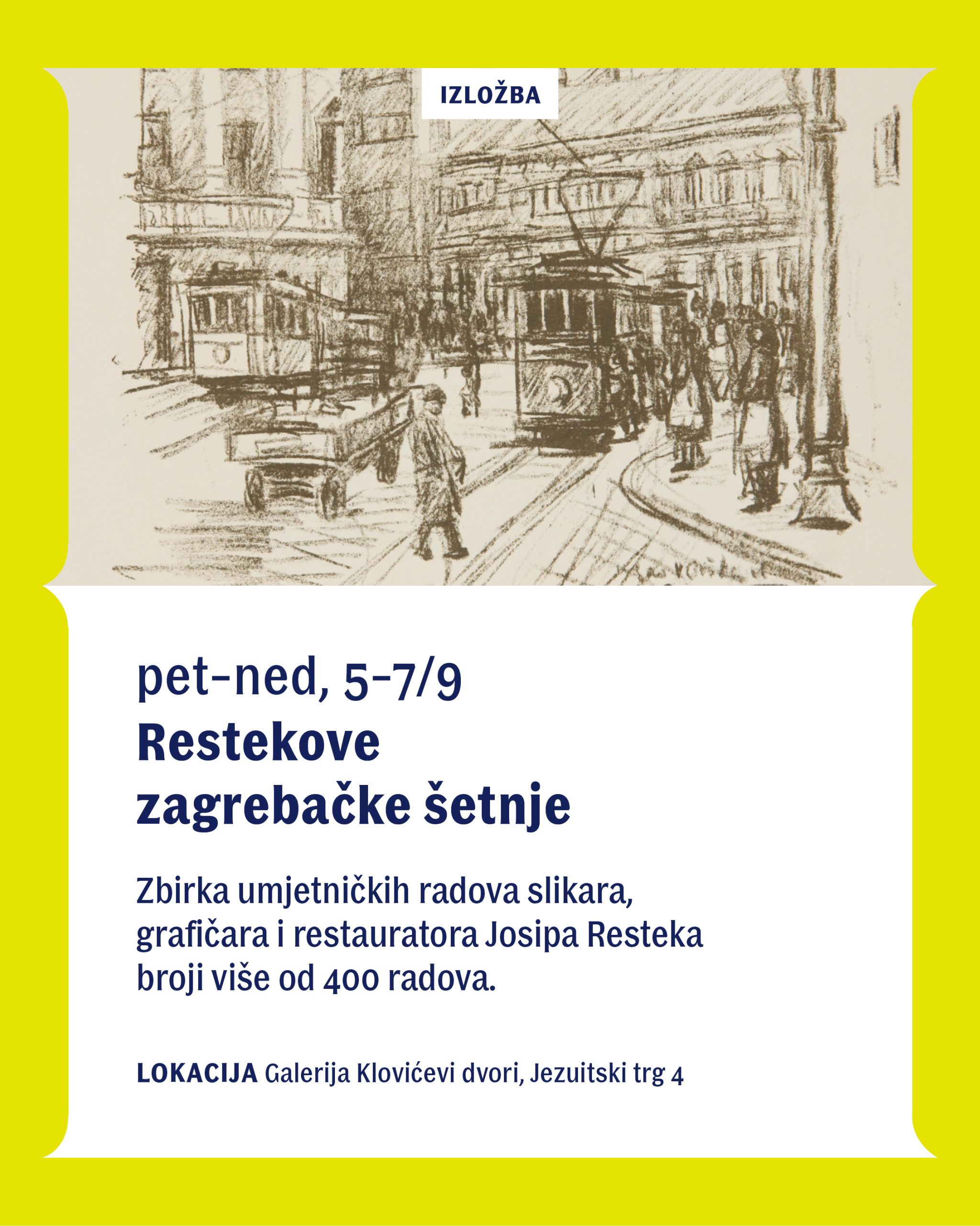 Zbirka umjetničkih radova slikara, grafičara i restauratora Josipa Resteka broji 410 radova – crteža, akvarela, samostalnih grafičkih listova, grafičkih mapa i ulja. Zbirku je 2006. godine umjetnikova udovica, gospođa Blanka Restek darovala Gradu Zagrebu, te se ona od tada čuva u Galeriji Klovićevi dvori. Josip Restek rođen je 7. ožujka 1915. godine u Volavju kraj Jastrebarskog, te povodom 110. godišnjice umjetnikova rođenja predstavljamo izbor grafika iz navedene donacije. Josip Restek našem je glavnom gradu Zagrebu posvetio čak tri grafičke mape – grafičku mapu iz 1949. godine s osam litografskih listova, mapu iz 1965. godine koja sadrži osam drvoreza u boji, te mapu iz 1986. godine koja sadrži osam linoreza, koje su na ovoj izložbi prikazane u kronološkom slijedu. Grafike iz mape „Zagreb“ iz 1965. godine otiskivali su učenici Škole primijenjene umjetnosti i dizajna u Zagrebu, te je otisnuto 212 primjeraka svakog lista.