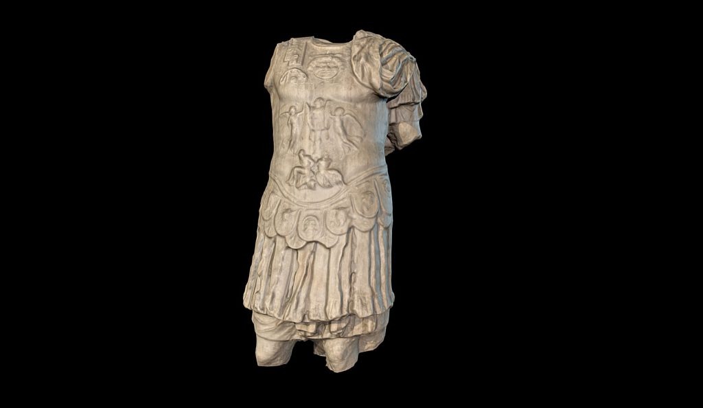Crtež je prvi vidljivi oblik umjetnikove vizije bez obzira na konačan medij u kojem će se ta vizija ostvariti. I Torzo rimskog imperatora je nepoznati umjetnik prvo skicirao ili izradio studiju. Vidimo na fotografiji da osim oklopa nošnju kipa čine kratka tunika i kožnata podstava / oklop s bedrenim i ramenim trakama koje završavaju resicama te ogrtač. Oklop je bogat reljefnom dekoracijom: na sredini prsa nalazi se apotropejska Gorgona, ispod koje dvije lebdeće Viktorije pridržavaju tropej na kojemu se vidi zarobljeno neprijateljsko oružje – kaciga, oklop, štitovi. Dva reda pteriga (pločice) također su ukrašena reljefnim prikazima poput rozeta, ovnovskih, slonovskih i lavljih glava, ljudskih lica te palmeta.