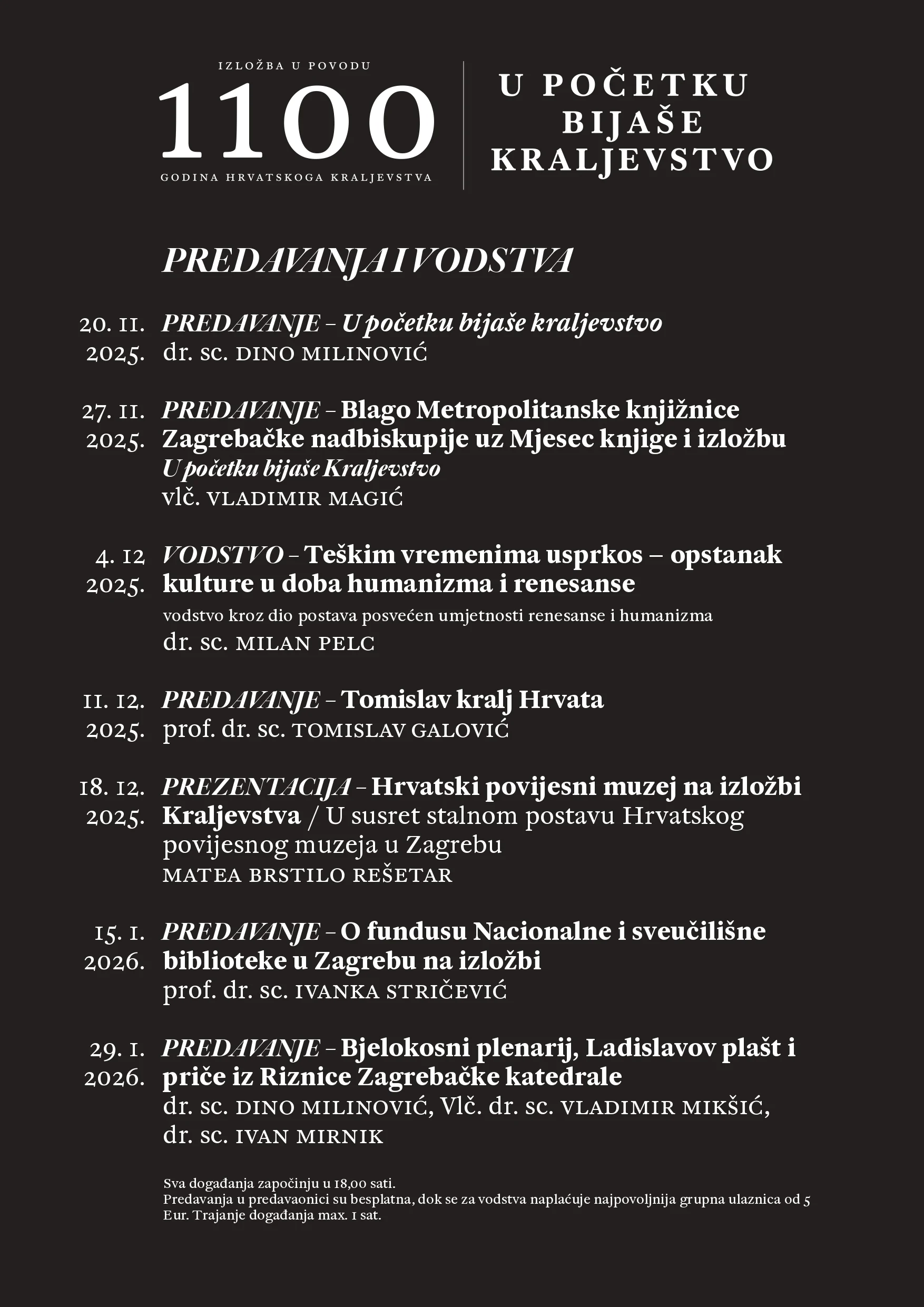 pozivamo Vas na predavanja i vodstva koja će se održati u našoj Galeriji u sklopu izložbe “U početku bijaše Kraljevstvo – 1100 godina Hrvatskoga Kraljevstva”.